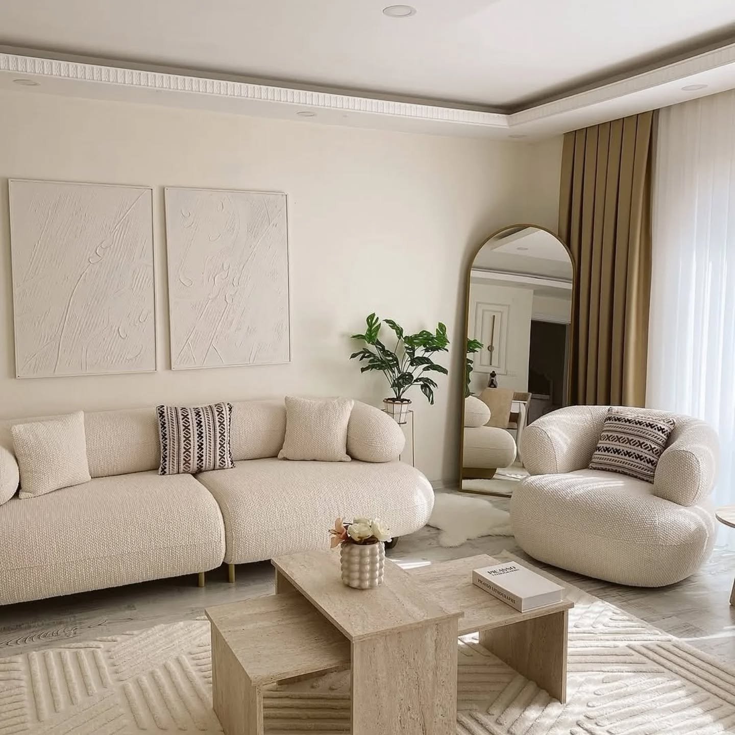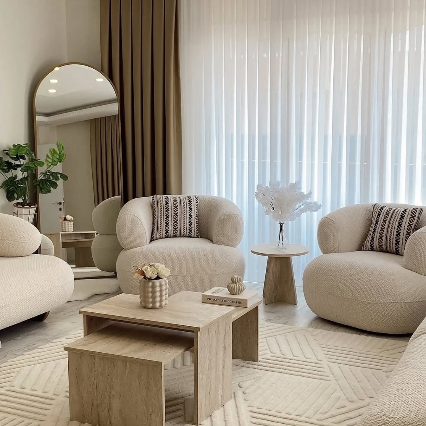 This cloud bouclé sofa set gives your space a calm, modern finish. The rounded silhouette and textured bouclé fabric create a soft look, while the matching 3 seater and two accent chairs give you balanced seating for guests and daily use. The ivory tone keeps the room bright and works well with wood, beige, and neutral décor.
