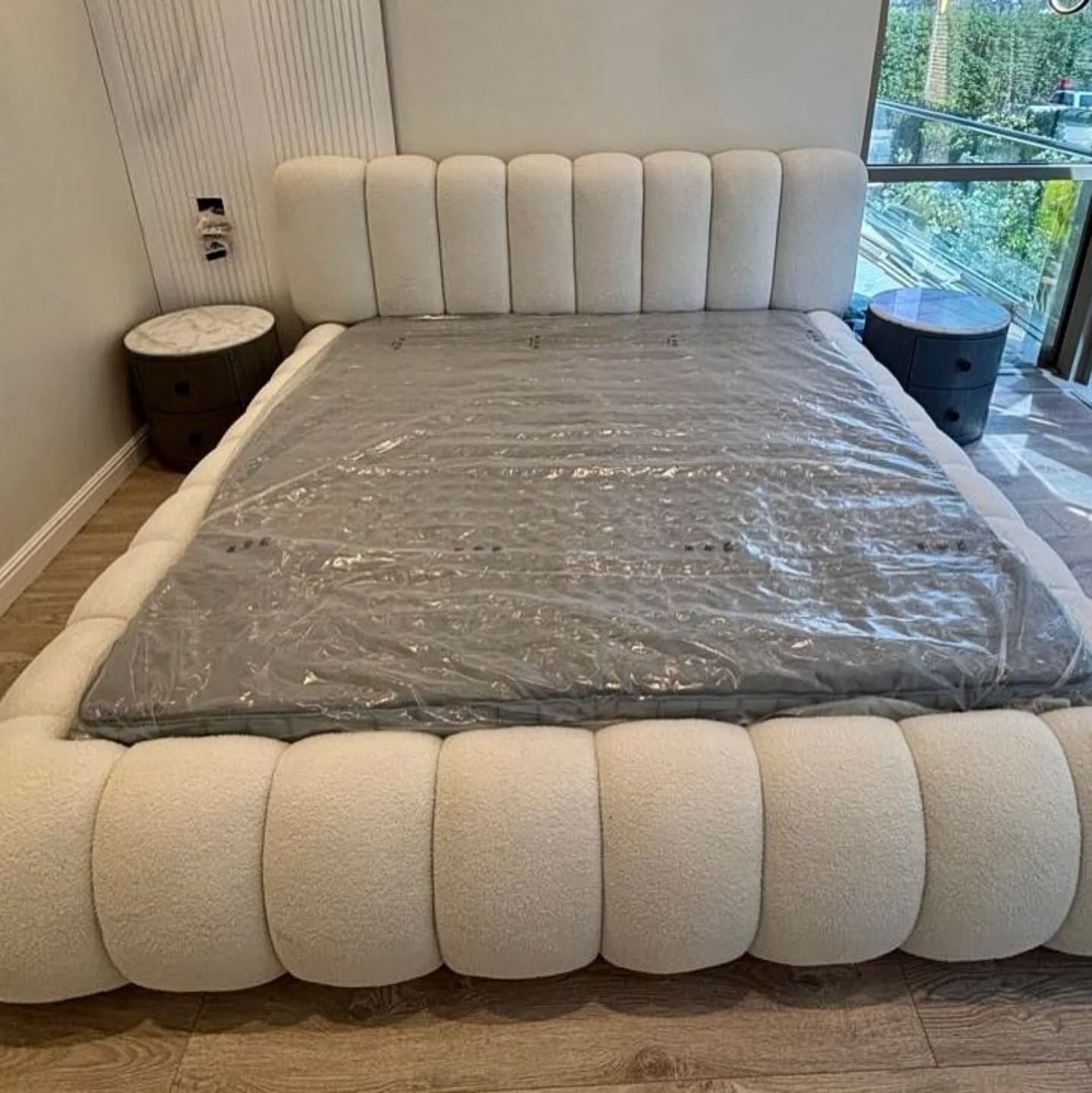 A statement boucle bed with a full padded footboard and a tall channel headboard. Choose 5×6 or 6×6 for a clean, luxury bedroom setup in Kenya.