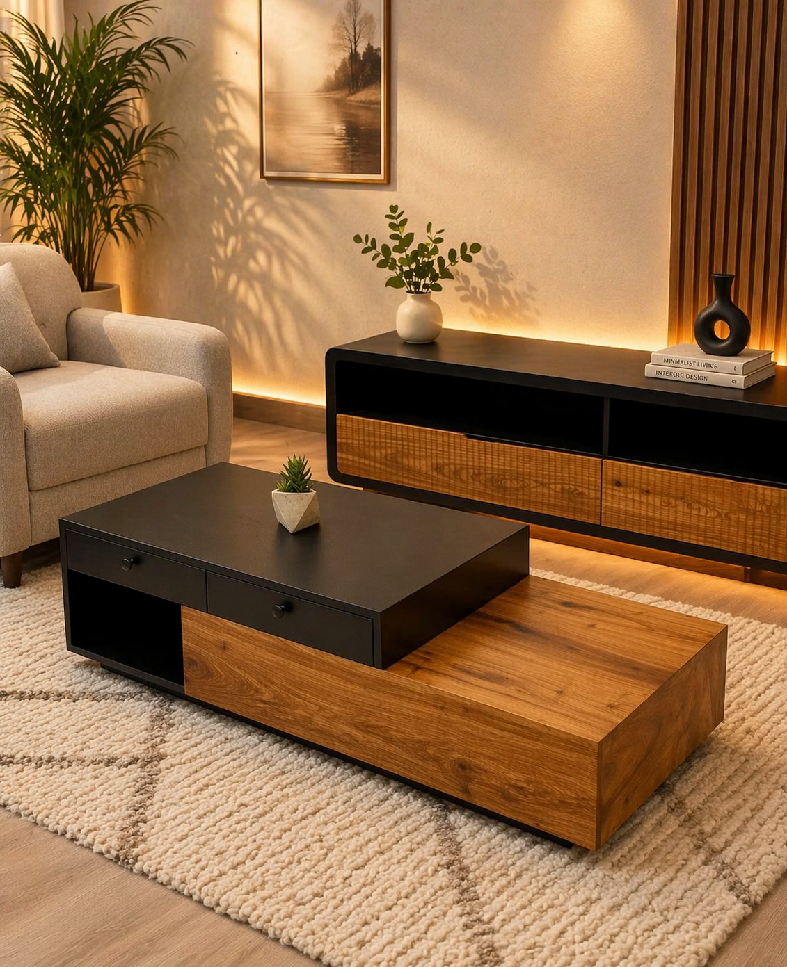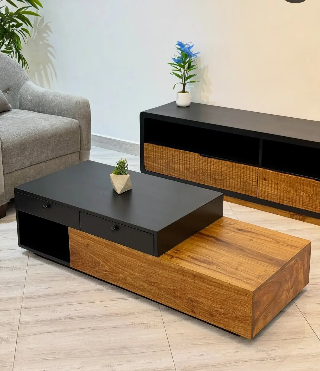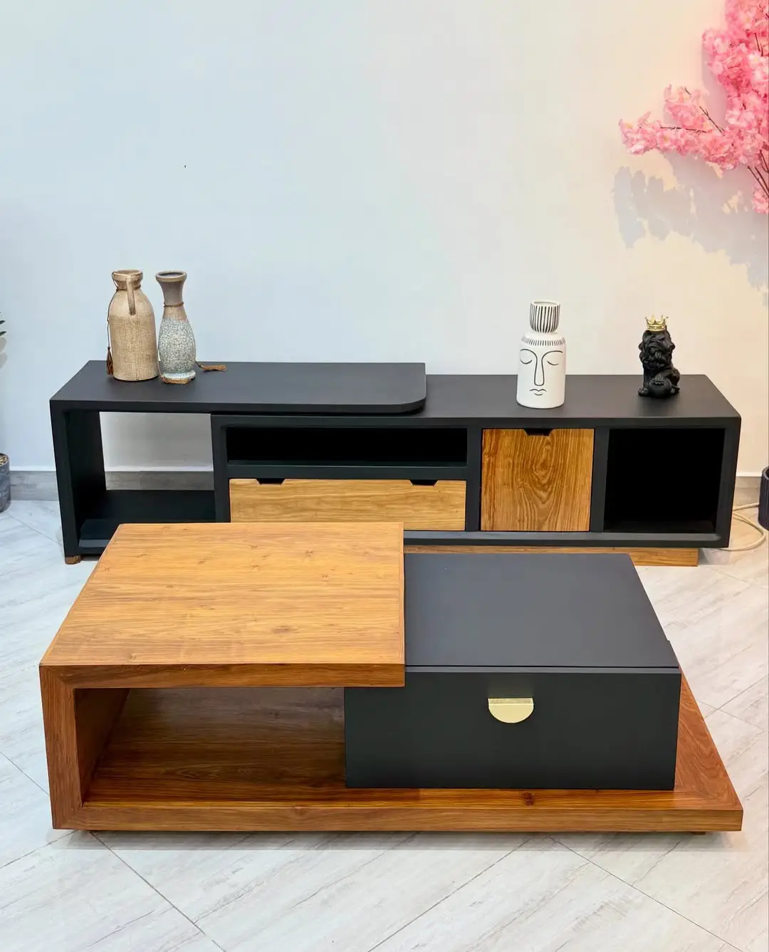The upper section includes built-in drawers, ideal for storing everyday items while keeping your space neat. The lower base extends outward in a contrasting wood-tone finish, adding depth and a modern design edge. The combination of dark and wood tones, as shown in the photos, makes this table a standout centrepiece in any indoor living setup.