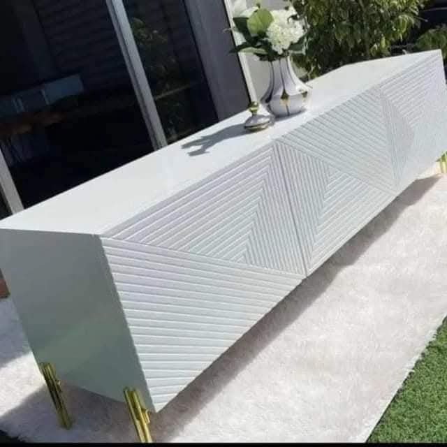 This geometric white TV stand is the epitome of modern design, blending crisp white panels with abstract gold-lined patterns that turn heads. Built on a solid elevated base, it’s a perfect fusion of functionality and flair.