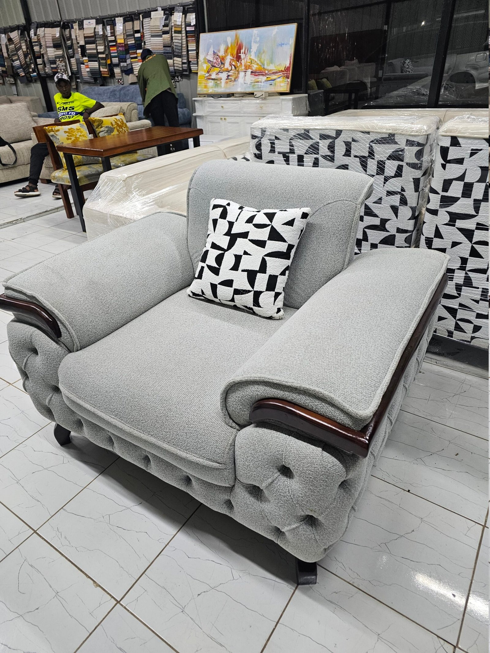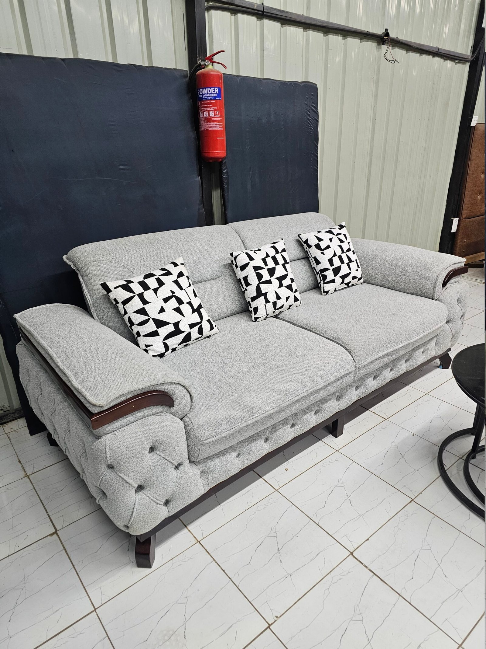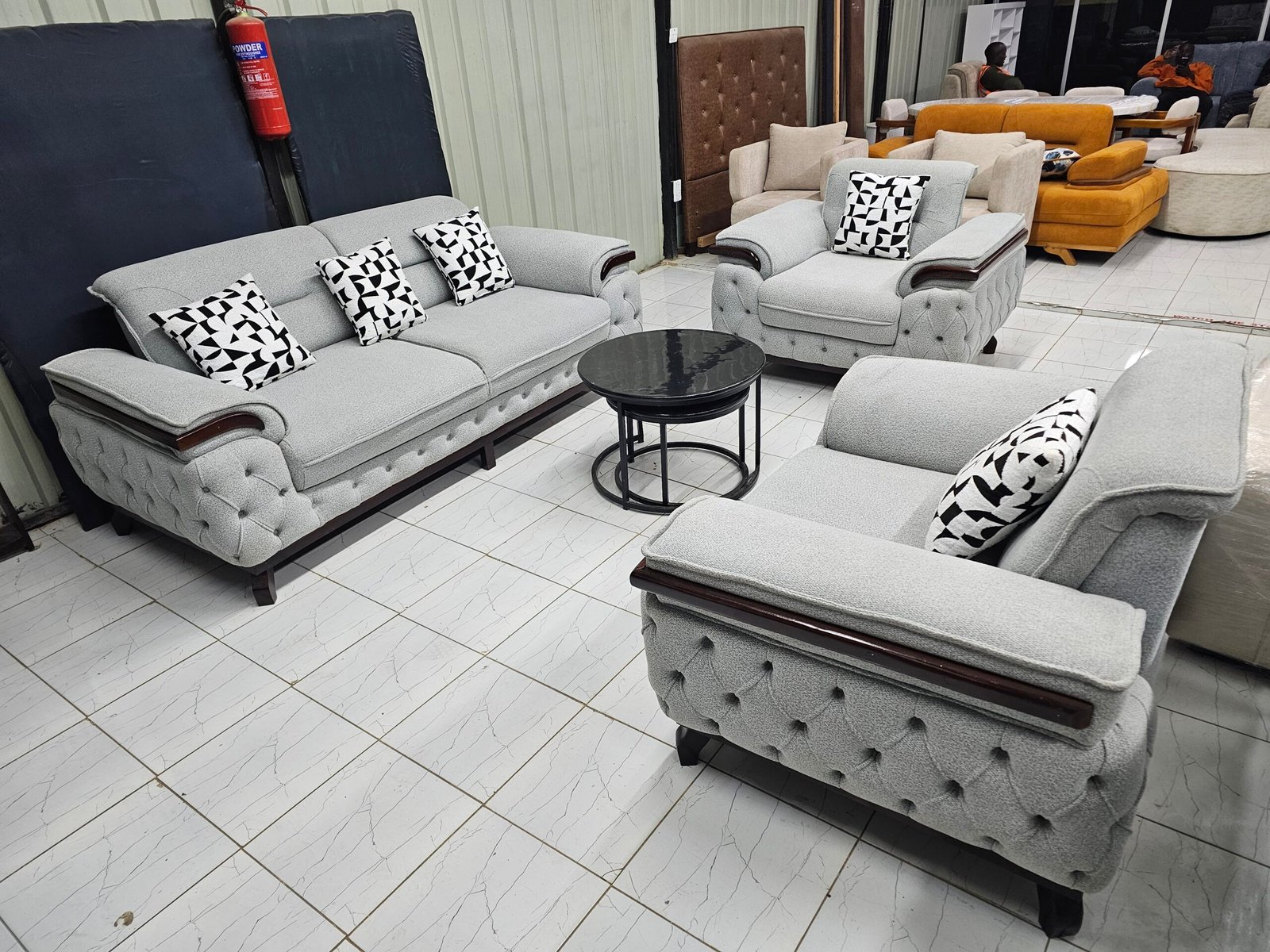 This grey tufted sofa set gives you a complete living room solution with a balanced 3-1-1 layout. The neutral grey fabric fits Nairobi homes where you want a calm look that matches most wall colours and floors.