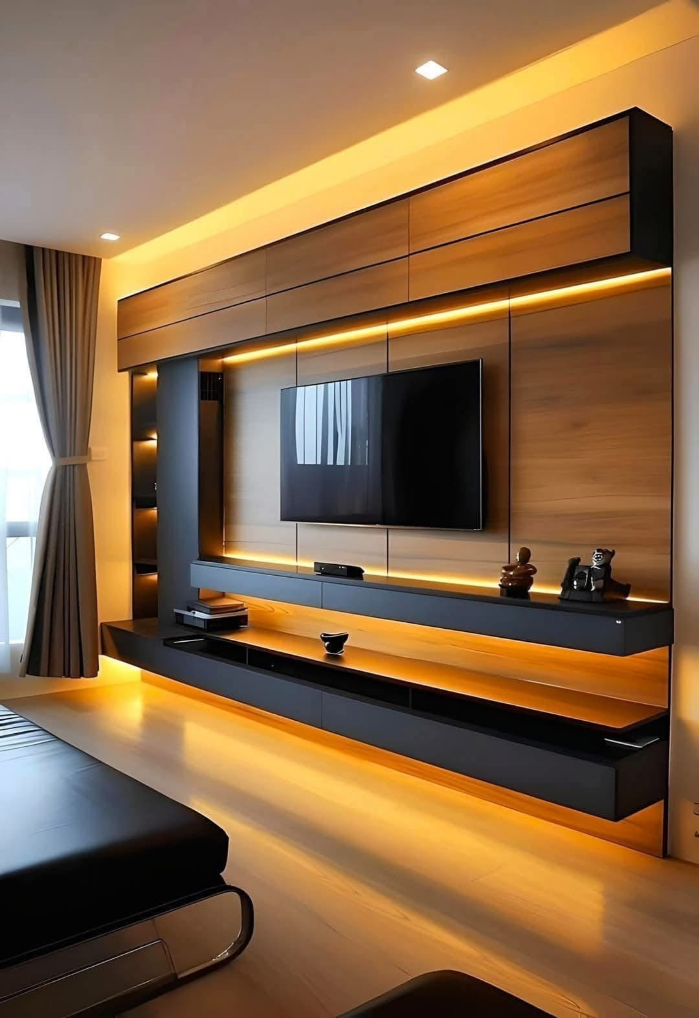 This modern floating TV wall unit with wood panels and LED lighting is a luxurious feature wall designed to elevate contemporary homes in Kenya. The design showcases a rich wood-look panel backdrop combined with sleek horizontal floating elements, creating a layered and visually striking composition.