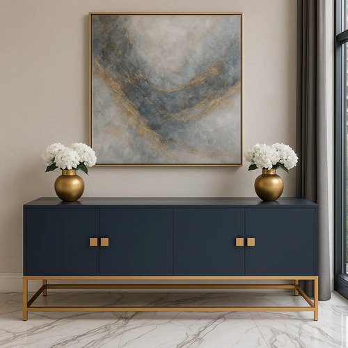 The cabinet features a dark blue finish with smooth front panels and subtle square handles. It sits on a sleek gold-toned metal base that adds a luxurious touch while maintaining a minimalist look. The wide top surface provides ample space for your TV and decorative pieces such as vases and artwork, as shown in the photos.