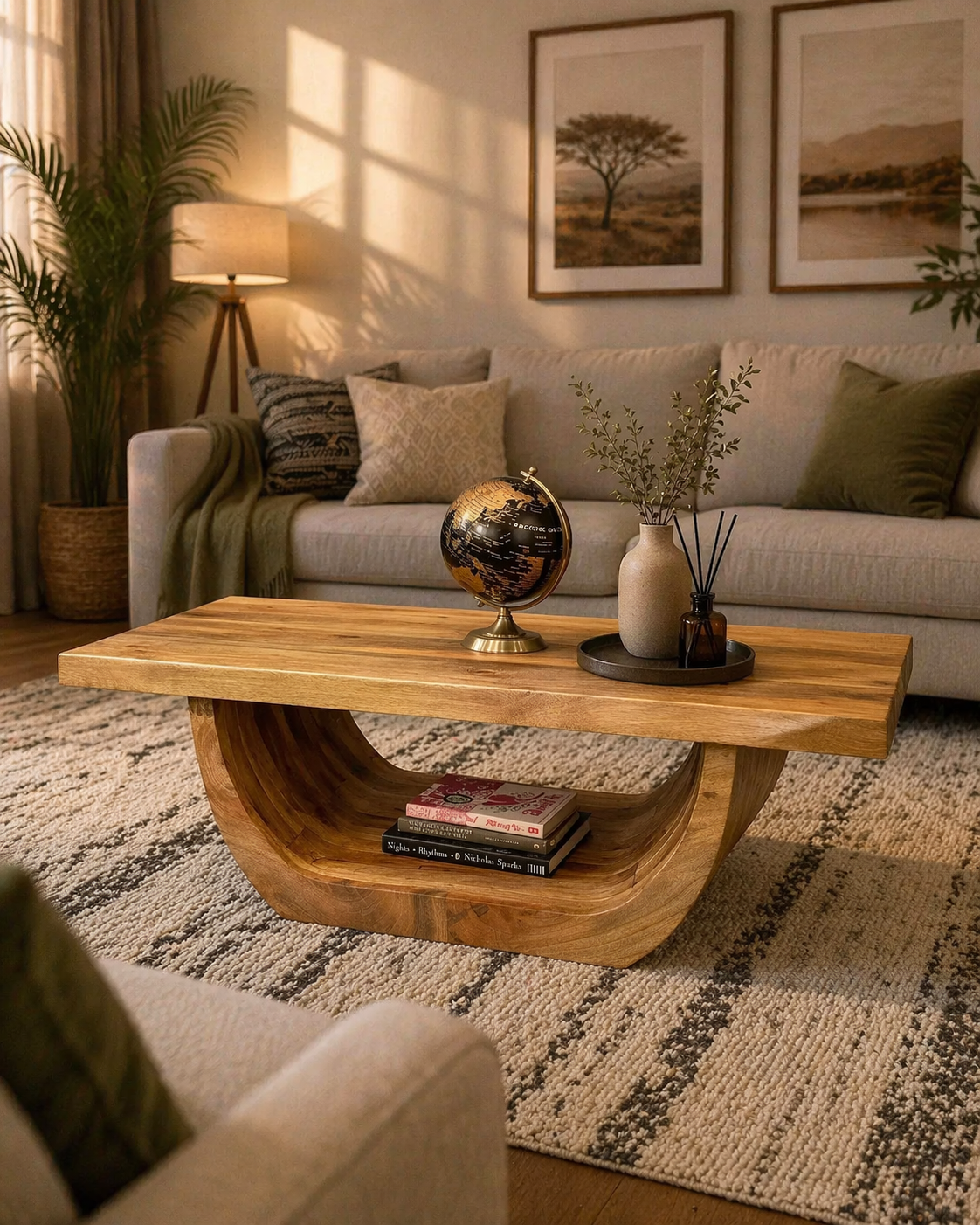 Modern Solid Wood Coffee Table is designed to bring warmth and character into your living space while offering practical everyday use. The standout feature is its smooth rectangular top paired with a unique curved base that creates an open shelf underneath, as shown in the photos.