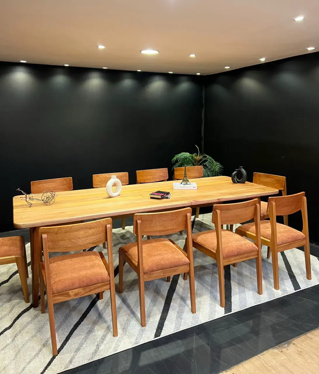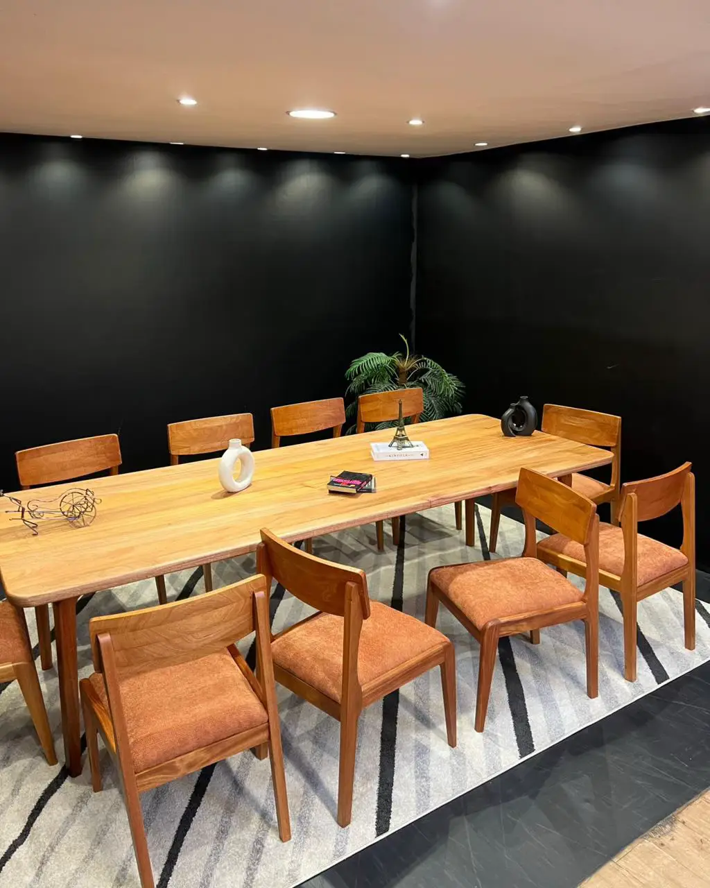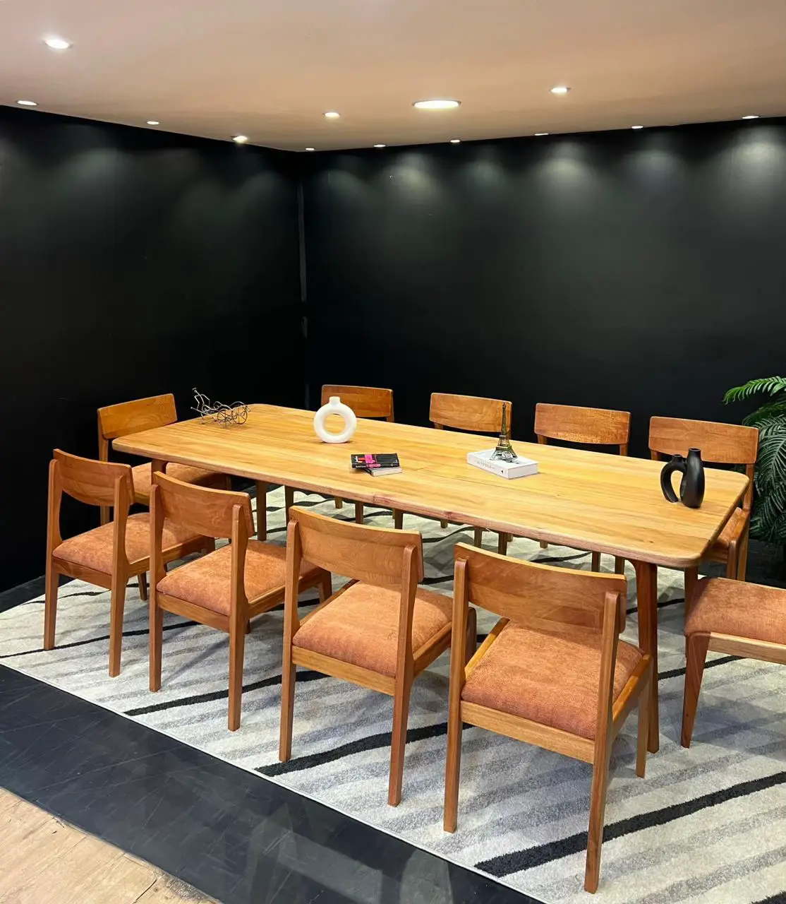 Spacious 8 seater wooden dining table set with upholstered chairs. Perfect for family dining and Airbnb spaces.