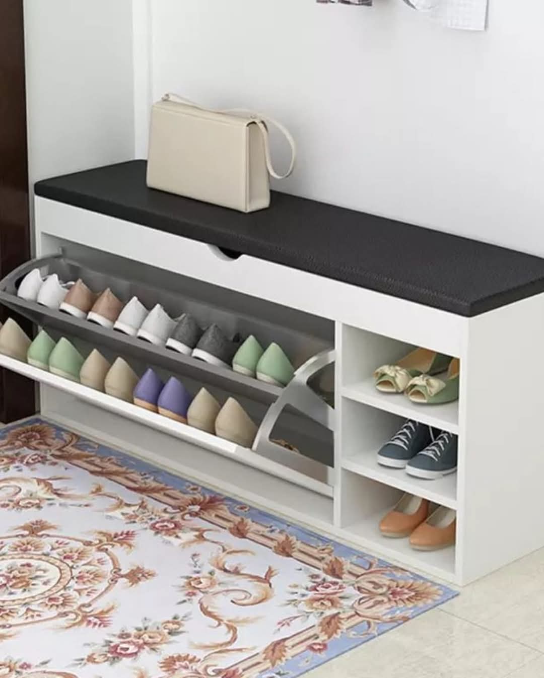 Add comfort and order to your entryway with this multifunctional shoe rack bench, crafted for both seating and smart storage. Featuring a soft black cushioned seat, this unit includes a rotating drawer-style rack that neatly organizes shoes out of sight and easy-access open shelves on the side for everyday footwear.