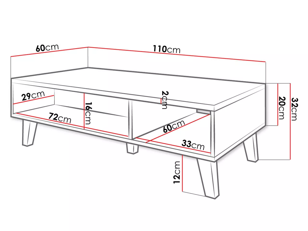 110 cm (L) × 60 cm (W) × 32 cm (H)