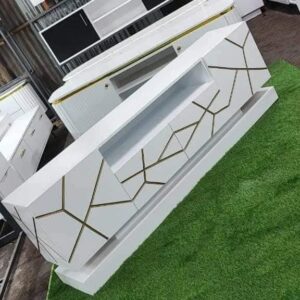 Add a touch of sophistication to your living space with this ultra-modern white TV stand featuring elegant geometric gold detailing. The clean, angular lines and raised platform base give it a floating illusion, while the bold design speaks volumes about your style. Ideal for modern Kenyan homes, this stand offers smart storage with both open shelves and a pull-out drawer to keep your space organized. Whether you’re streaming or gaming, this TV stand enhances your viewing area beautifully.