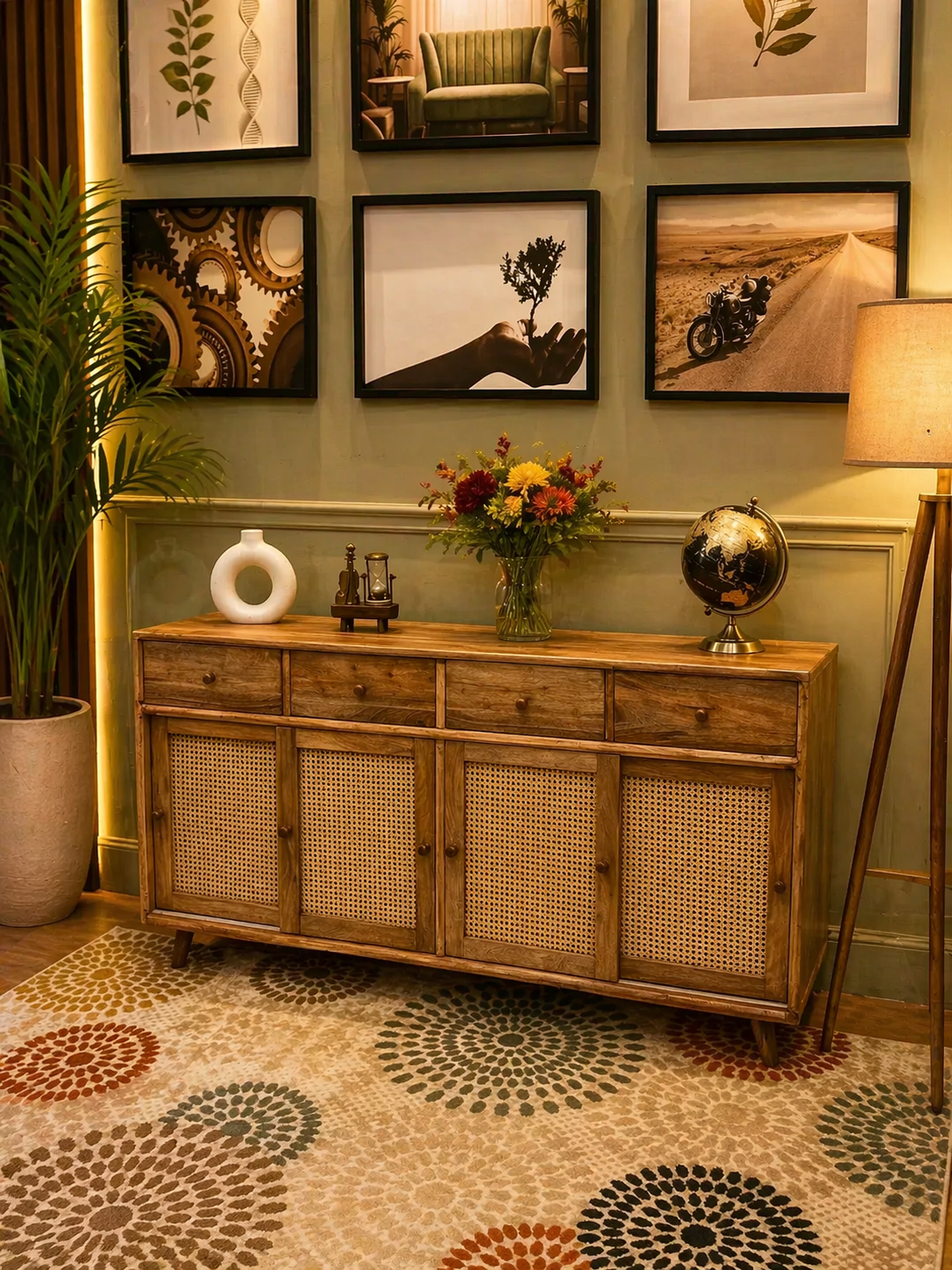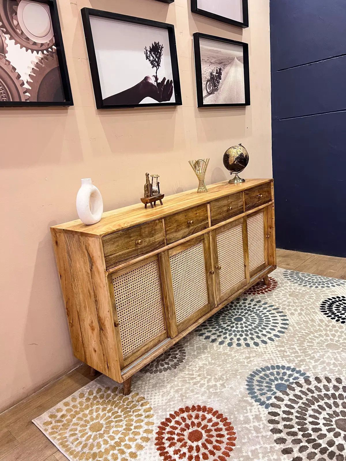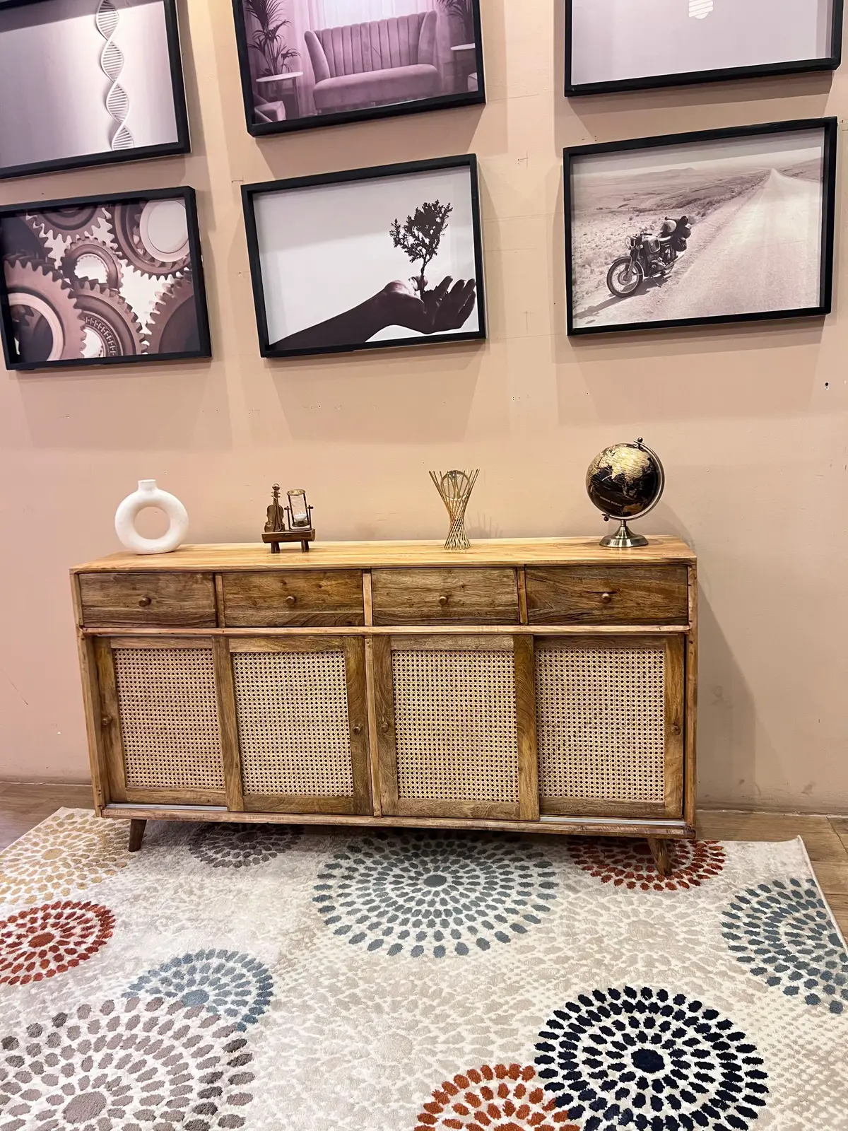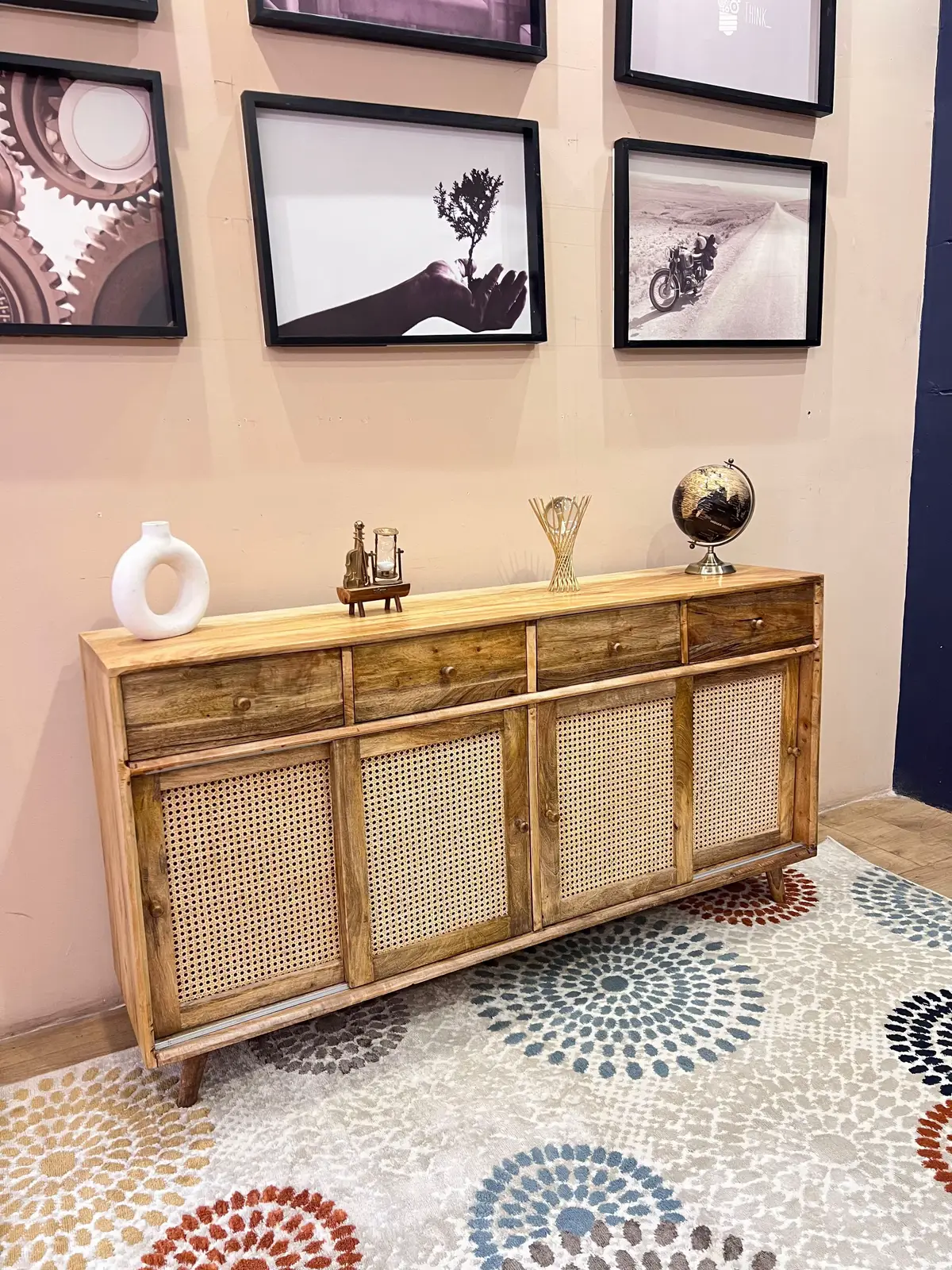 Wooden sideboard cabinet Kenya designed to bring natural warmth and practical storage into your home. This piece combines a clean wooden structure with woven rattan-style panel doors, creating a timeless look that fits both modern and classic interiors.