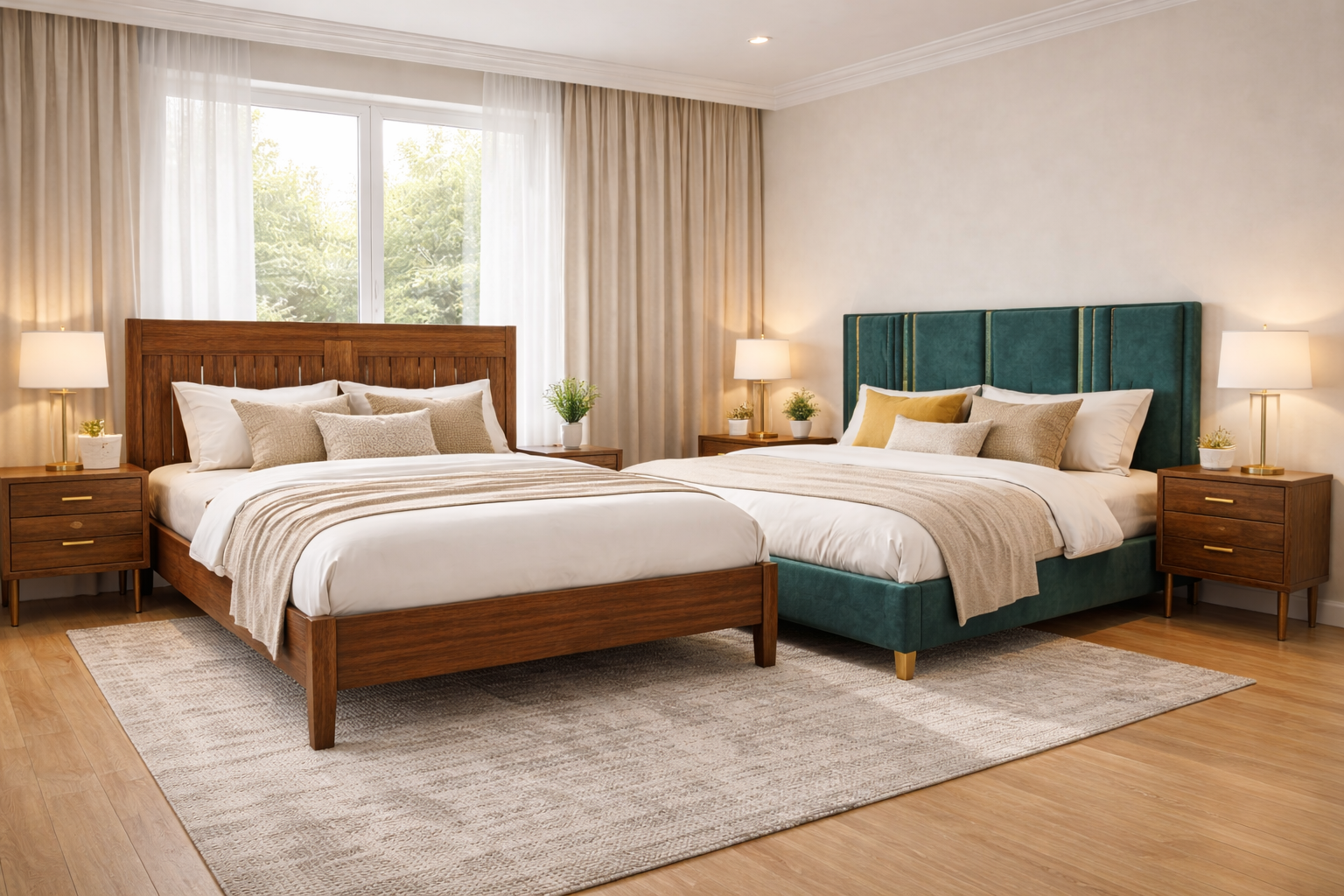 It starts with the bed. Whether you prefer the spacious luxury of king beds or the cozy fit of queen beds, the frame you choose provides the structural support necessary for a good night’s rest. Our designs range from upholstered headboards that offer a soft backrest for reading to sleek wooden frames that provide a clean, uncluttered look.